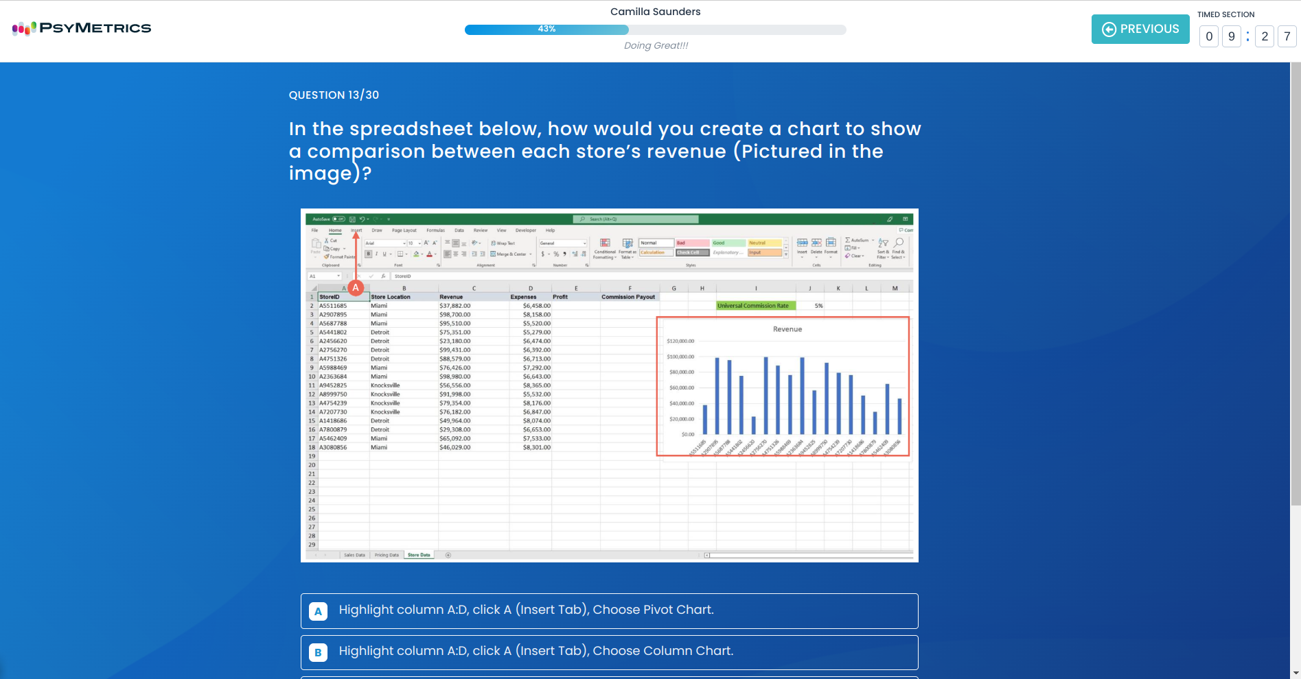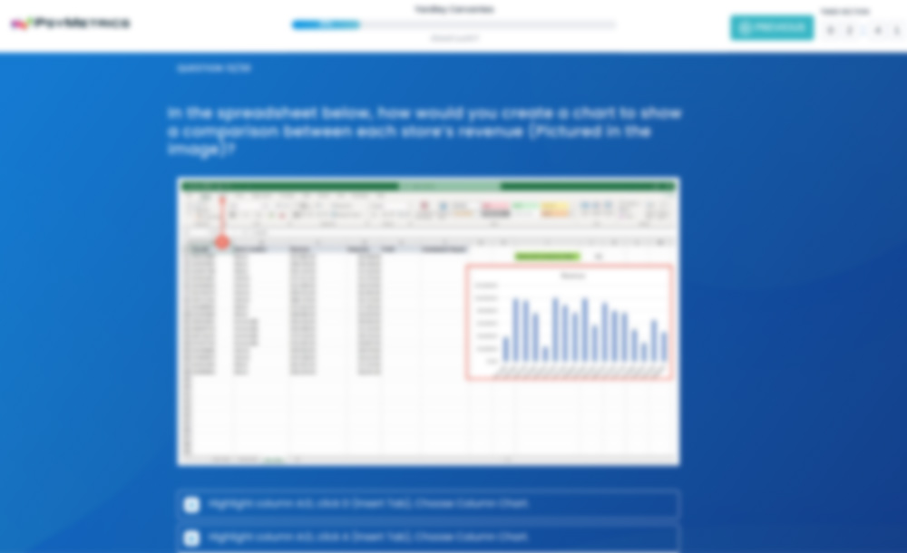 The Office Skills-Excel Skills Test assesses an individual's skill level by requiring them to answer questions relating to the following Excel functions (Analysis, Editing, File Management, Formatting, Functions, Graphics and Tools and Automation). Scores for Basic, Intermediate and Advanced levels are provided.