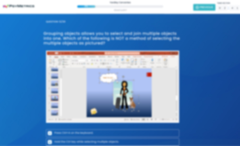 The Office Skills-PowerPoint Skills Test assesses an individual's skill level by requiring them to answer questions relating to the following Power Point functions (Create a Presentation, Enhance a Presentation, File Management, Slide Show, Slide Sorter and Text & Graphics). Scores for Basic, Intermediate and Advanced levels are provided.